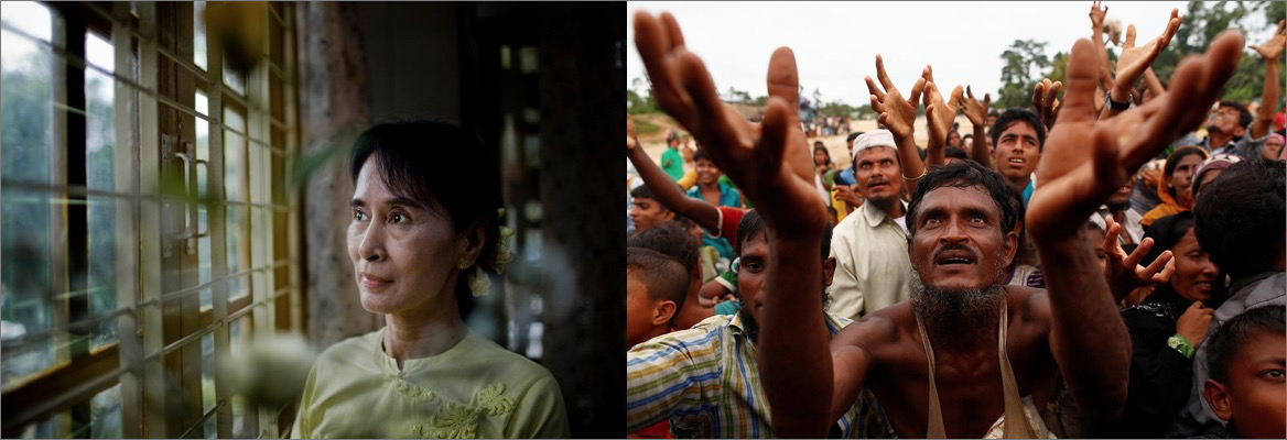 Aung San Suu Kyi, who spent 15 years under military house arrest in Burma; (r) Rohingya refugees receiving food in Bangladesh, 2017